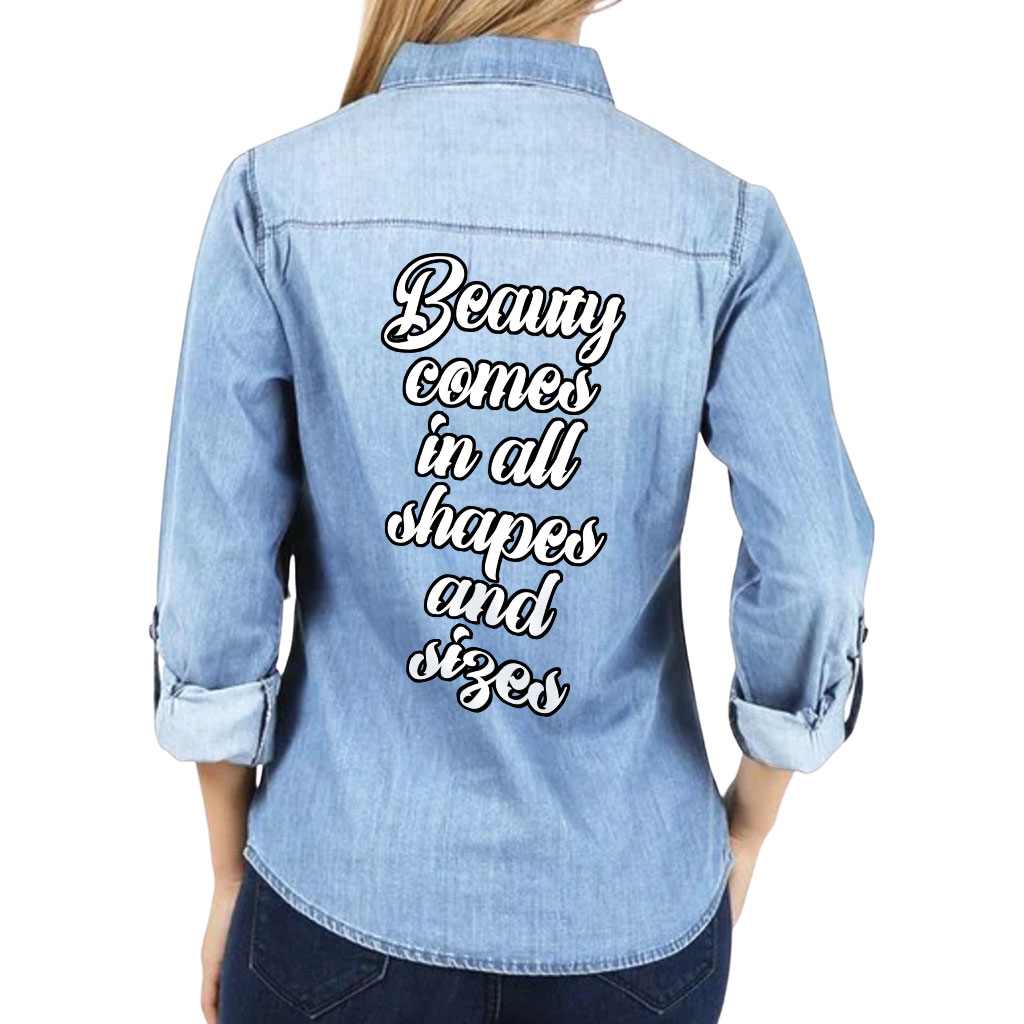 Buy Beauty Comes in All Shapes and Sizes Women’s Long Sleeve Denim Shirt as a gift for your girlfriend, wife, friends for the coming Valentine’s Day, birthday, Anniversary, Graduation, Christmas, Mother’s Day, Thanksgiving, Easter, etc.