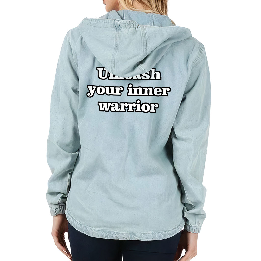Stay warm this season with Motivational Ladies Denim Jacket. Its heavyweight fabric ensures durability and comfort will never be compromised. Featuring a drawstring hood, this jacket is perfect for tackling any forecast life has to offer. Whether you are dealing with windy days or unexpected rain, this jacket gives you the protection you need while keeping your outfit on trend. So don’t let cold weather ruin your style: stay warm and stylish with Quotes Denim Jacket today!
