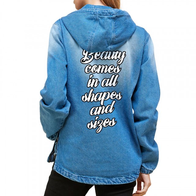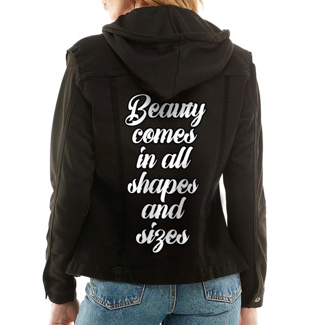Beauty Comes in All Shapes and Sizes Women’s Denim Jacket with Hoodie – Best Quote Ladies Denim Jacket – Themed Denim Jacket