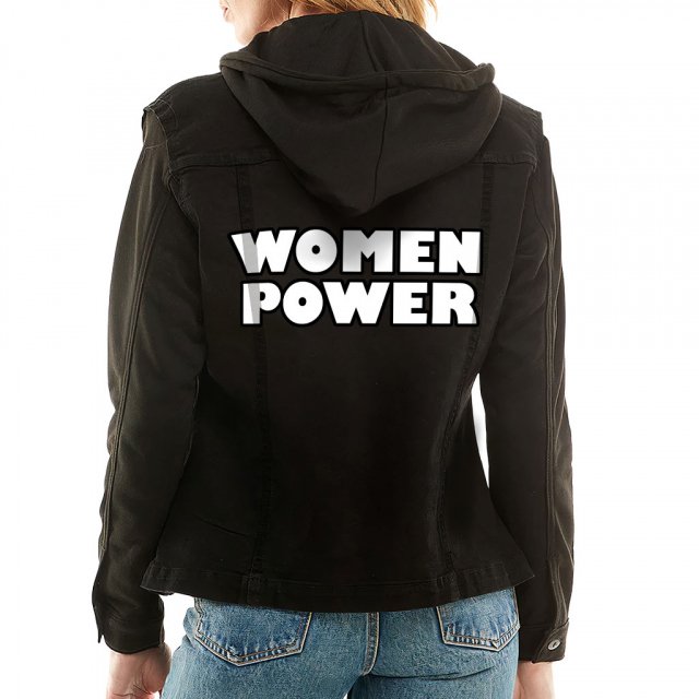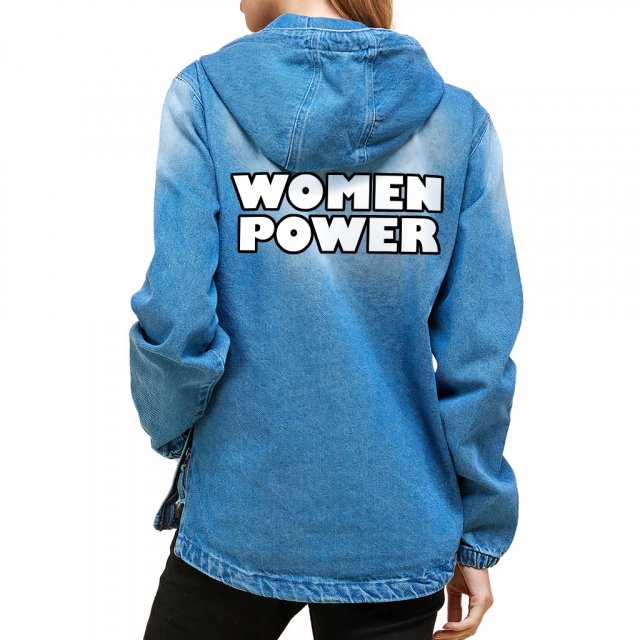 Women Power Women’s Denim Jacket with Hoodie – Cool Saying Ladies Denim Jacket – Graphic Denim Jacket