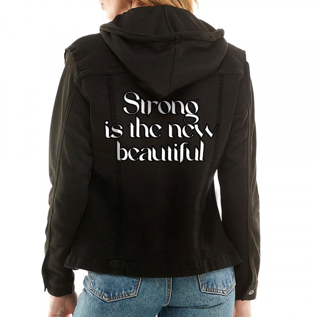 Strong Is the New Beautiful Women’s Denim Jacket with Hoodie – Trendy Ladies Denim Jacket – Cool Printed Denim Jacket
