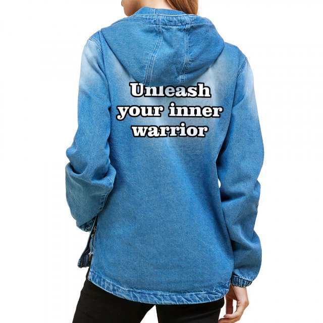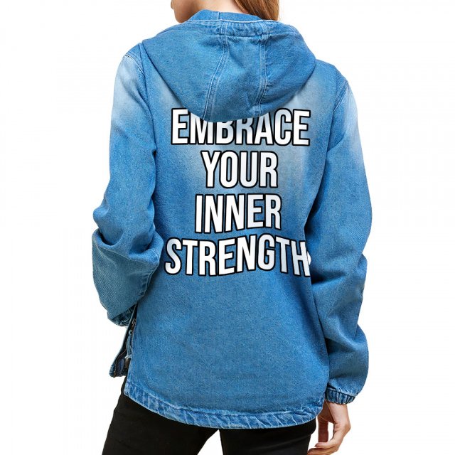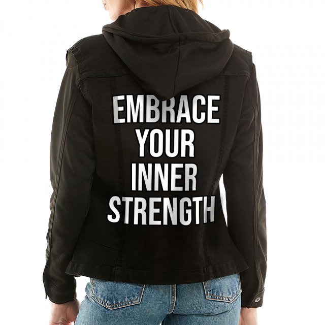 Inner Strength Women’s Denim Jacket with Hoodie – Inspirational Ladies Denim Jacket – Cool Printed Denim Jacket