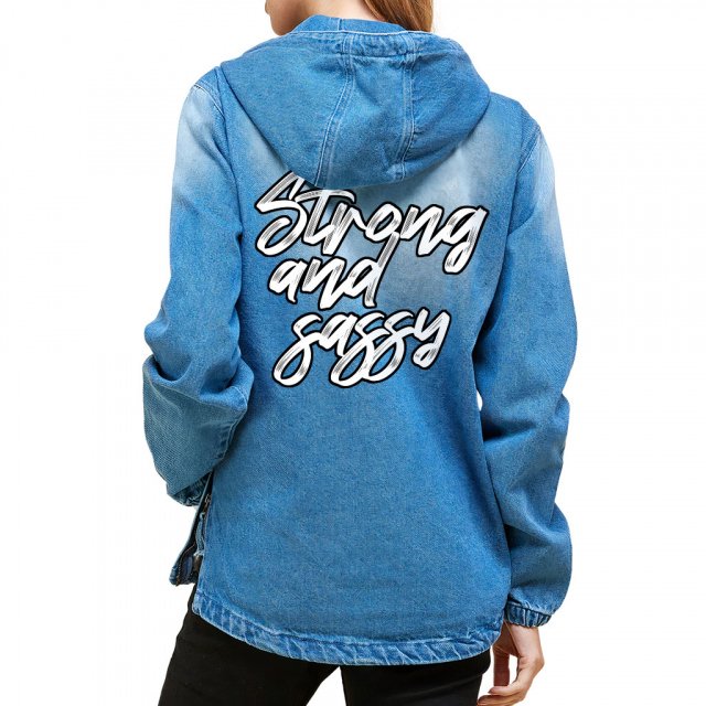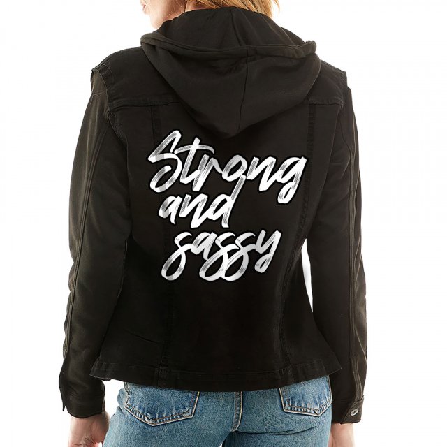 Strong and Sassy Women’s Denim Jacket with Hoodie – Cool Trendy Ladies Denim Jacket – Printed Denim Jacket