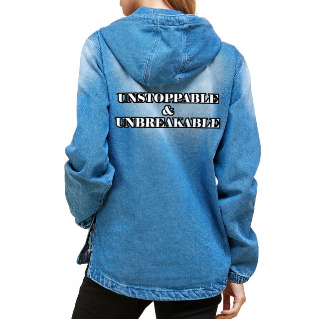 Unstoppable Women’s Denim Jacket with Hoodie – Cool Ladies Denim Jacket – Themed Denim Jacket