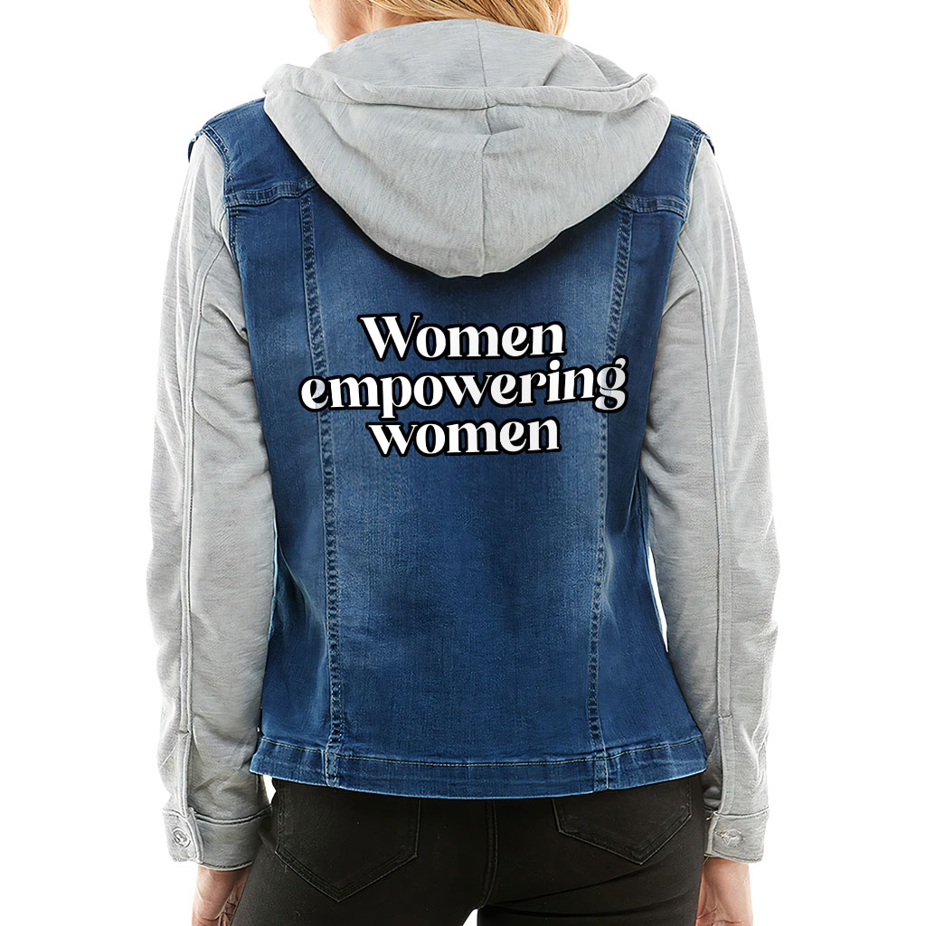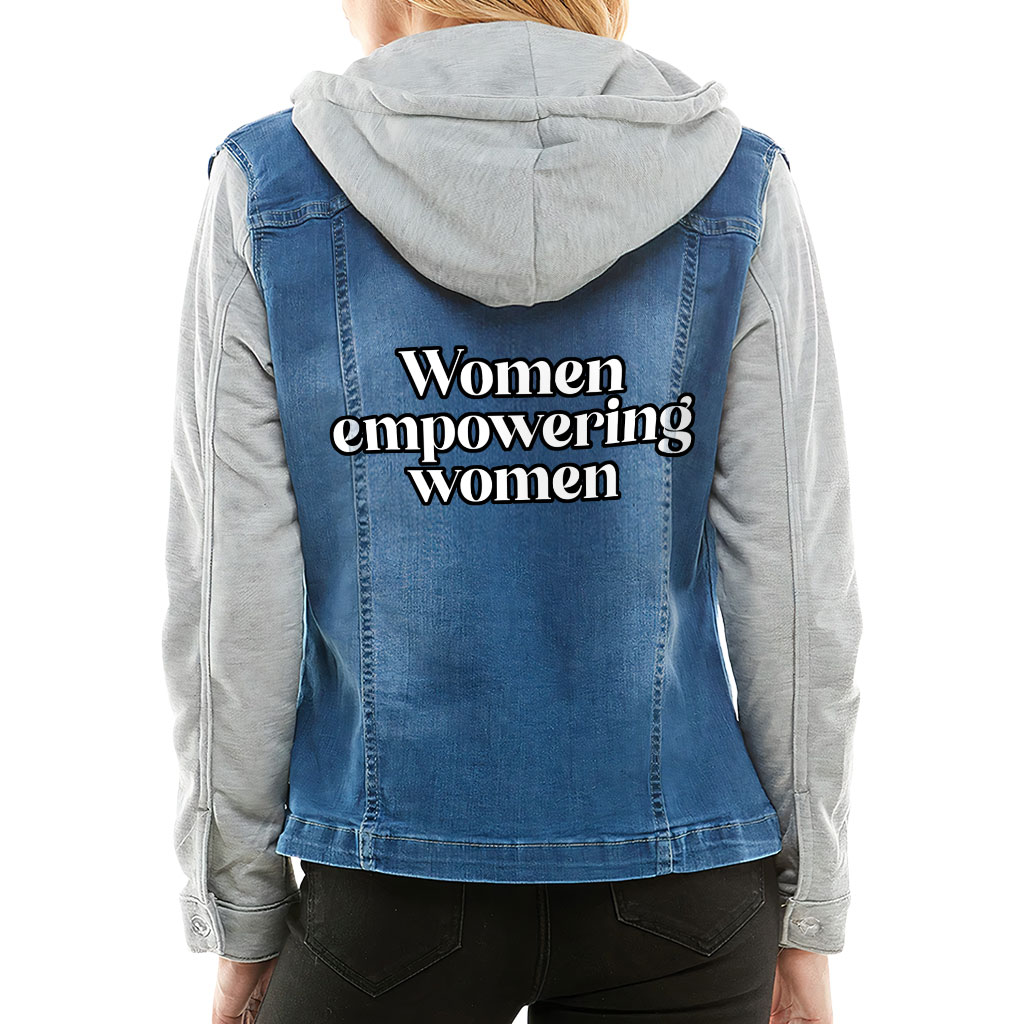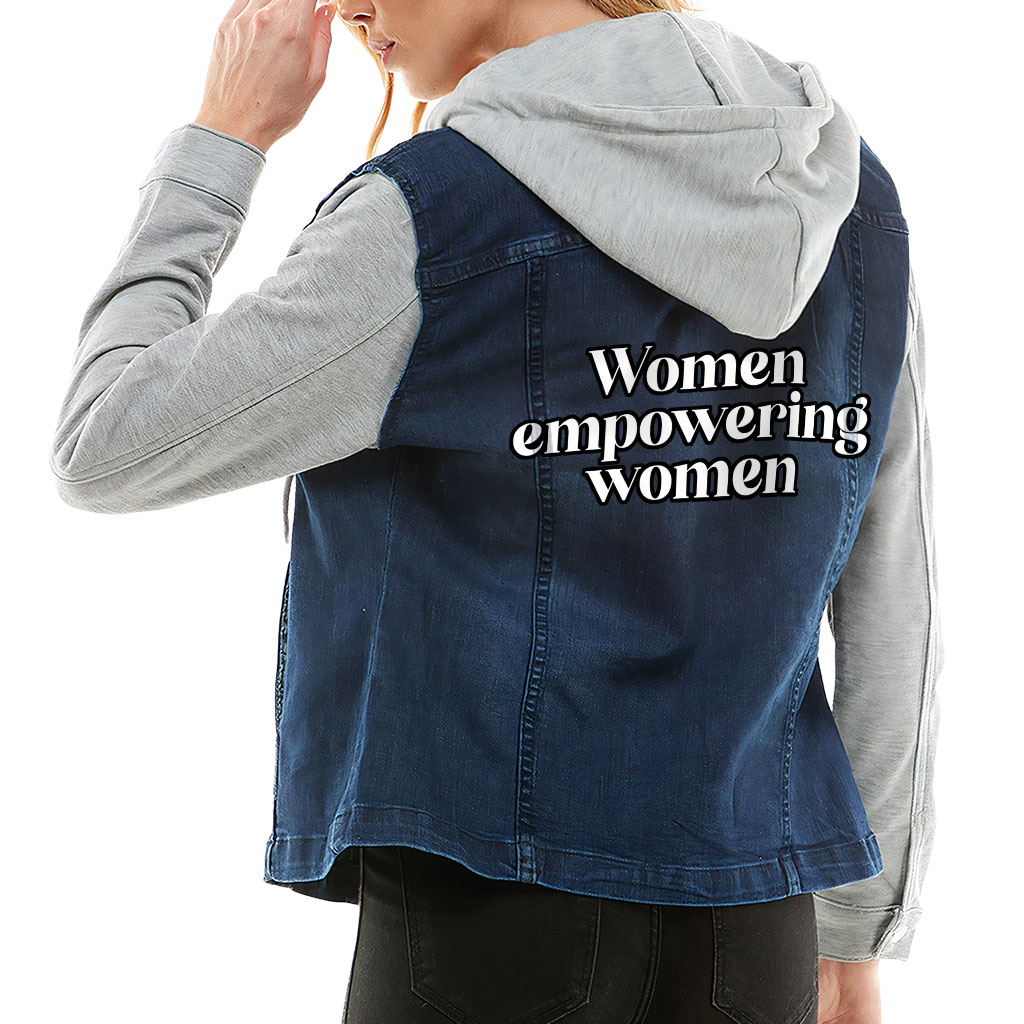 Empowering Women Ladies Denim Jacket with Fleece Hoodie – Inspirational Quote Women’s Denim Jacket – Graphic Denim Jacket