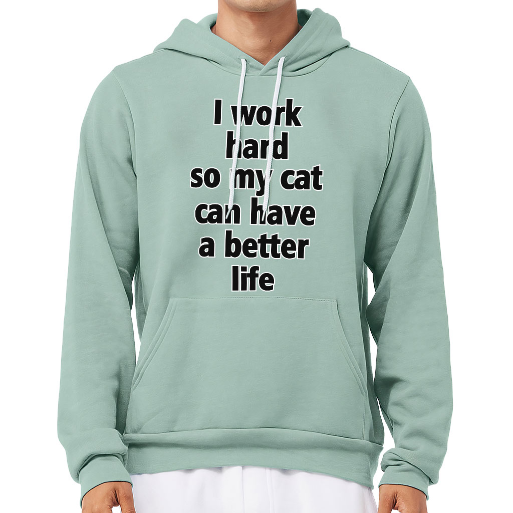 I Work Hard So My Cat Sponge Fleece Hoodie Look your best while staying comfortable in Funny Design Hoodie. Crafted with a modern retail fit, the hoodie features side-seamed detailing for improved shape retention — and you can always cinch it up with the white cord drawstring to make sure…