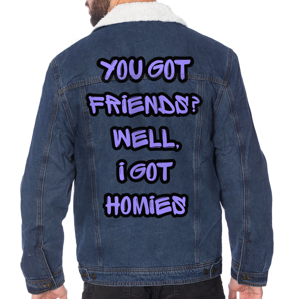 Funny Saying Denim Jacket keeps you warm and on-trend in the cold. With a soft Sherpa lining, this classic-fit jacket blends fashion and function, making it your go-to layering piece.