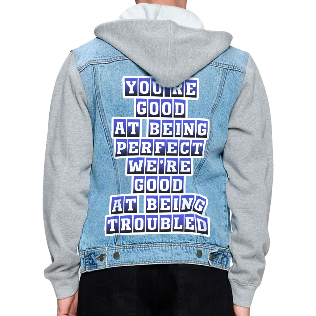 Make a bold statement with this stylish Quote Jacket With Fleece Hoodie! Crafted from 100% cotton, this fashionable jacket is perfect for all seasons. The denim fabric adds a classic feel to the overall look of your ensemble while the fleece hoody provides extra warmth and comfort. The unique combination of denim and fleece gives you a versatile piece that walks the line between contemporary and timeless design. You can rock it on its own or layer it over a t-shirt or henley for an effortlessly cool style. With its strong looks, Cool Printed Jacket for Men will become an integral part of your wardrobe and help you put together trendy everyday looks with ease!